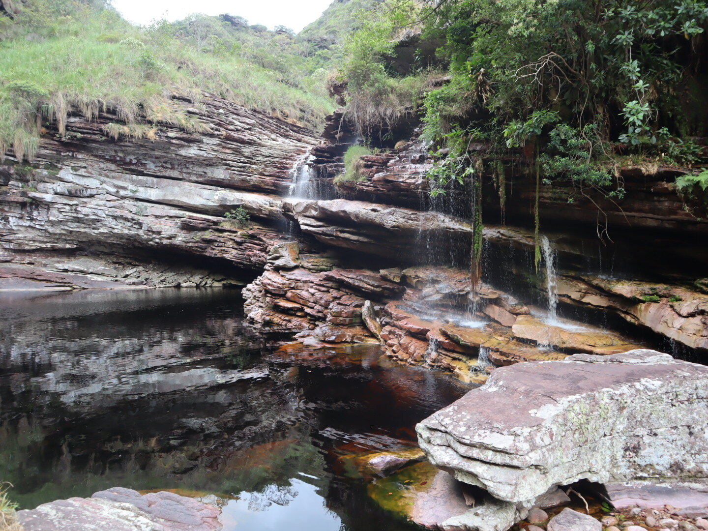 Nous partons vers un canyon au fond duquel se trouve une chute d’eau, la Chachoeira do Mixila. Nous traversons de la forêt tropicale, passons de rocher en rocher le long du lit de la rivière… Sans José c’était mission quasi-impossible. Le lit de la rivière est rose et violet, la végétation luxuriante et les libellules bleues par dizaines, c’est magnifique. Nous finissons par rejoindre un premier lac encadré de hautes parois ocres. Nous enfilons nos maillots de bain et laissons toutes nos affaires pour continuer à la nage ! Nous traversons un premier puis un deuxième lac, tous deux bien froids, à chaque fois nous nous hissons hors de l’eau grâce à une corde. José nous montre un cobra sur un cailloux ! Puis nous parvenons à la cascade, tout au bout du canyon ! Magique. L’eau dévale la paroi sur toute sa largeur, chute d’eau blanche au milieu de la végétation tropicale, ciel bleu, lac au pied de la chute et soleil qui fait briller l’eau. Nous nous baignons dans le lac, prenons une douche sous la chute, puis passons derrière celle-ci, un très bel arc-en-ciel se reflète sur l’a chute’eau. Instants hors du temps.