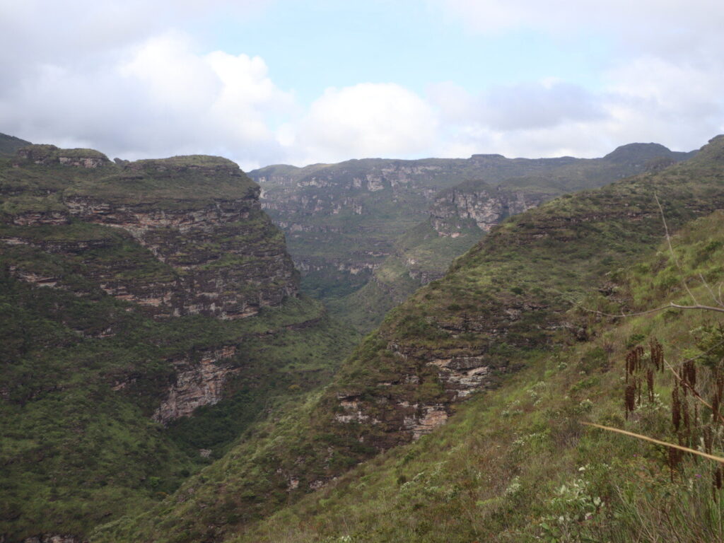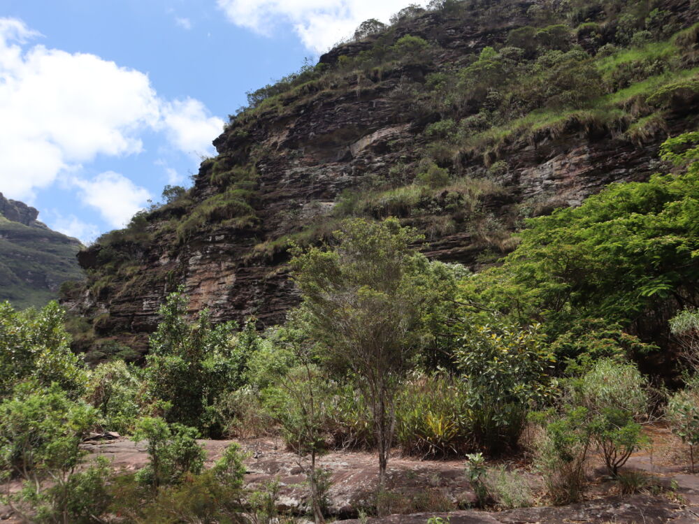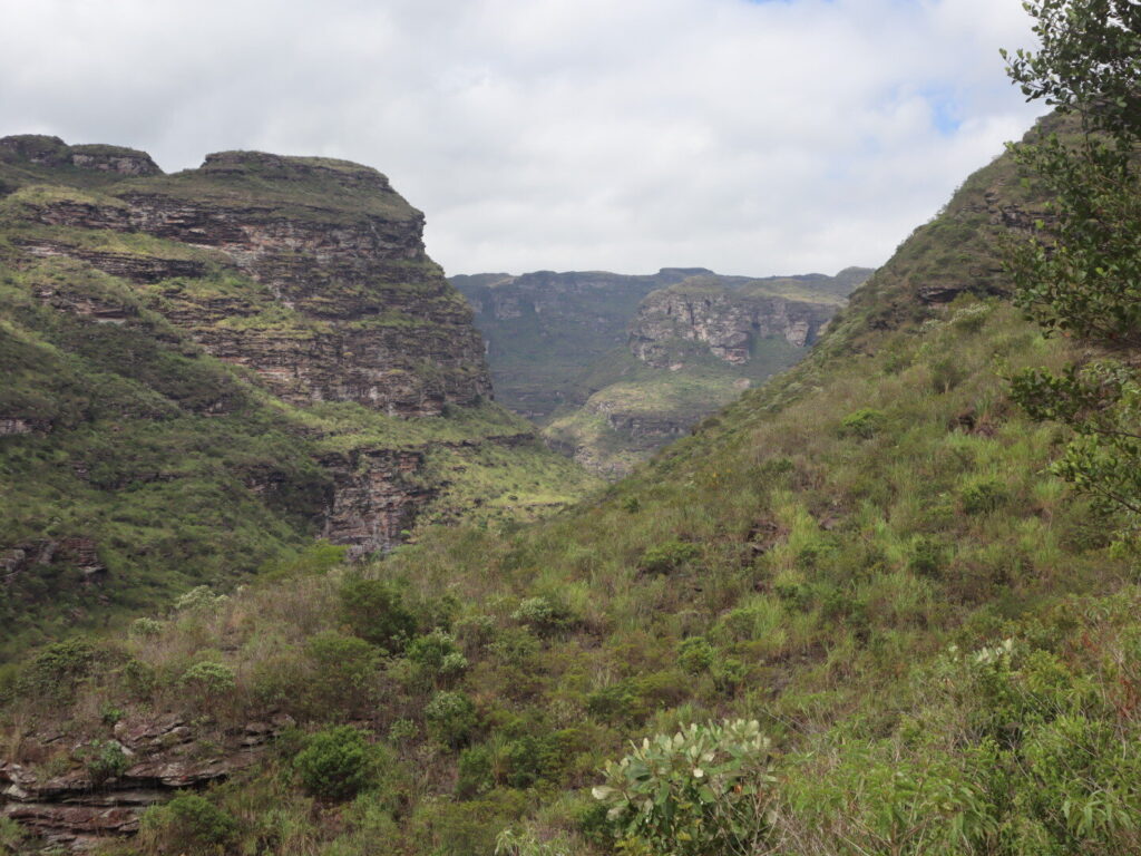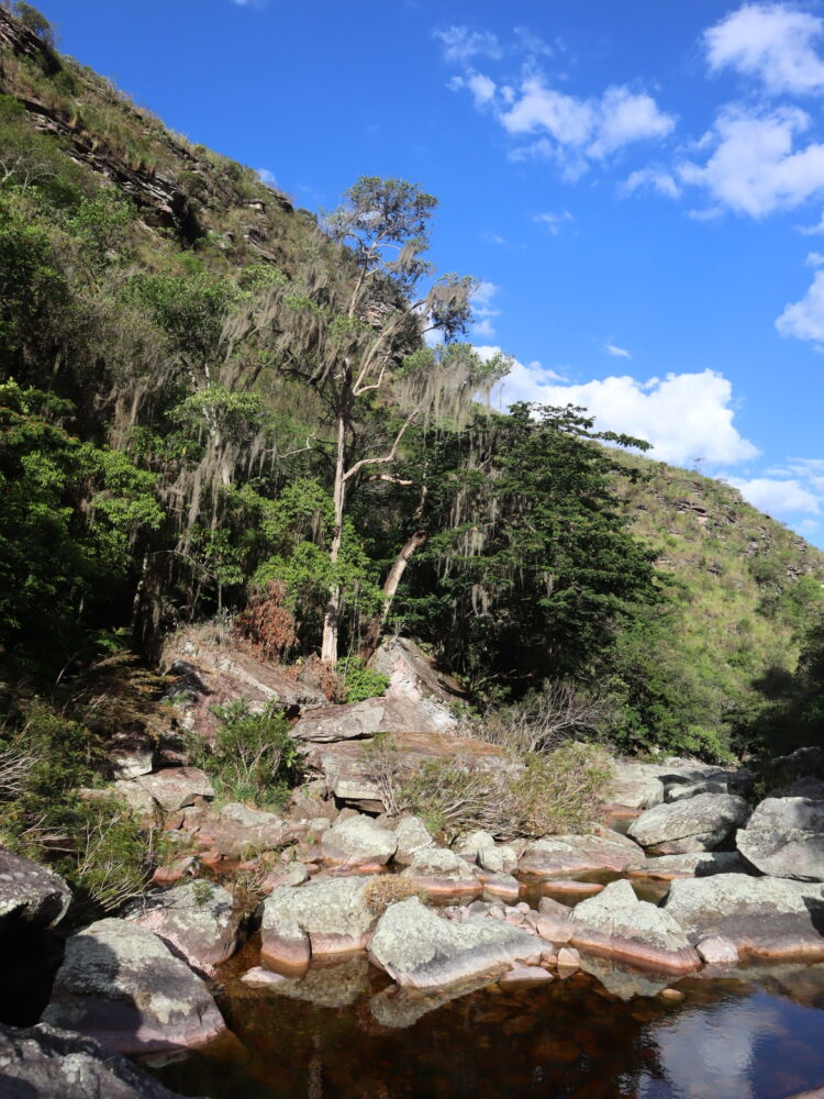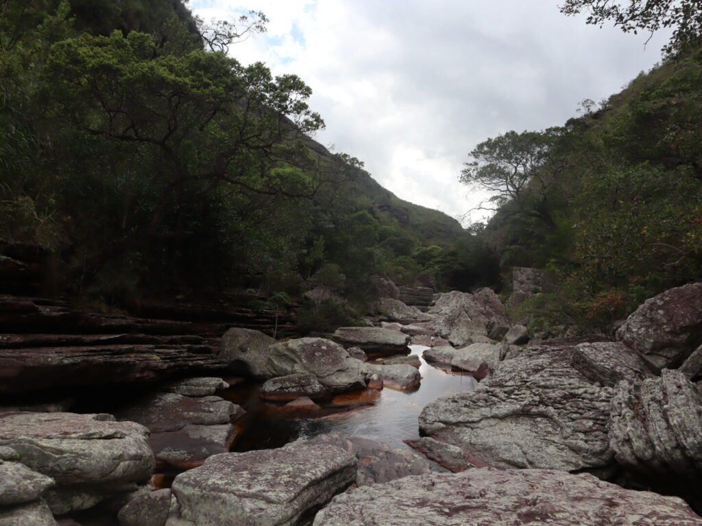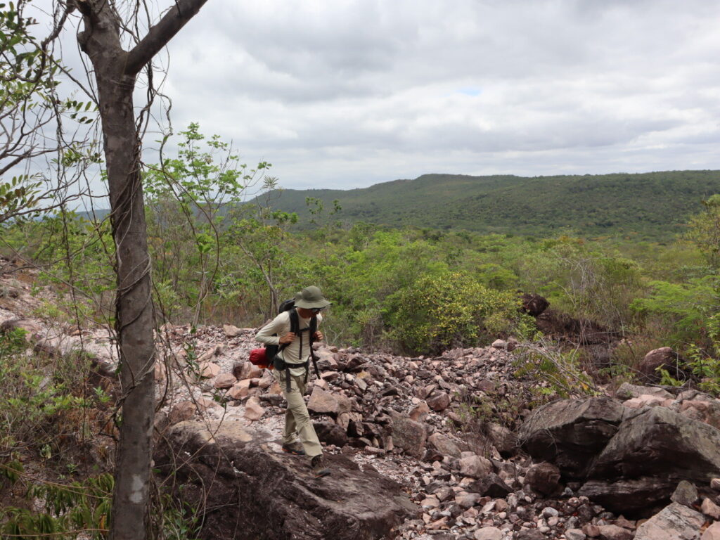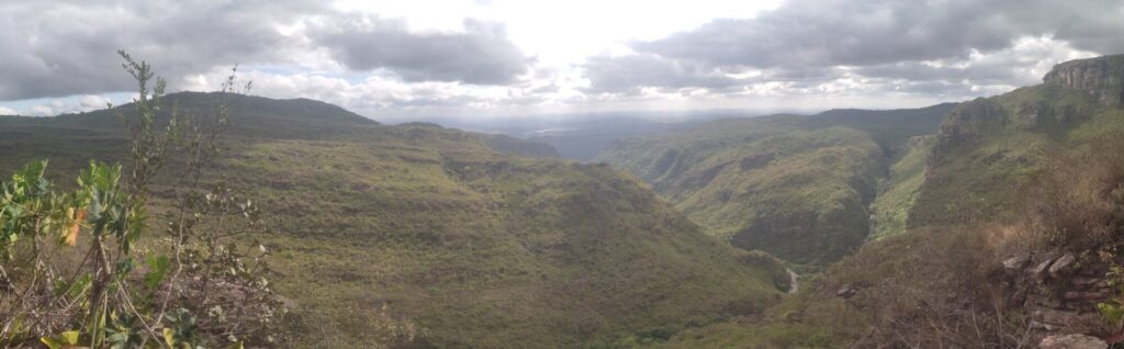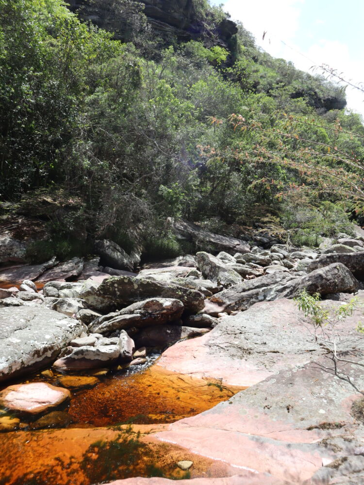 Départ sur le même sentier que deux jours plus tôt, puis nous sommes allés crapahuter dans la montagne. Sentiers très peu visibles, après un très beau point de vue sur la Chapada, descente jusqu’à un petit ruisseau puis encore un peu de montée au milieu d’une végétation très éparse, ça tape ! Enfin, descente pas si facile jusqu’au Riberão.