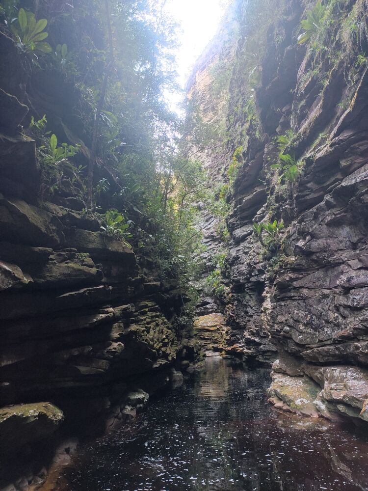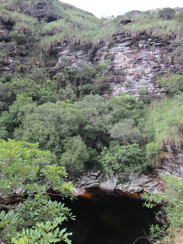 Départ à 7h ce matin, et comme nous revenons au même campement nous laissons la tente et ne prenons qu’un seul sac avec à manger, de l’eau et nos maillots. Nous descendons d’abord une pente bien raide pour retrouver le rio Fumaça qui s’écoule dans la vallée. Nous rejoignons rapidement une magnifique piscine entourée par de hautes falaises et dans laquelle se déversent deux belles cascades. La Cachoeira da Capivara. C’est le lieu parfait pour une petite baignade matinale, alors qu’il fait déjà très chaud !