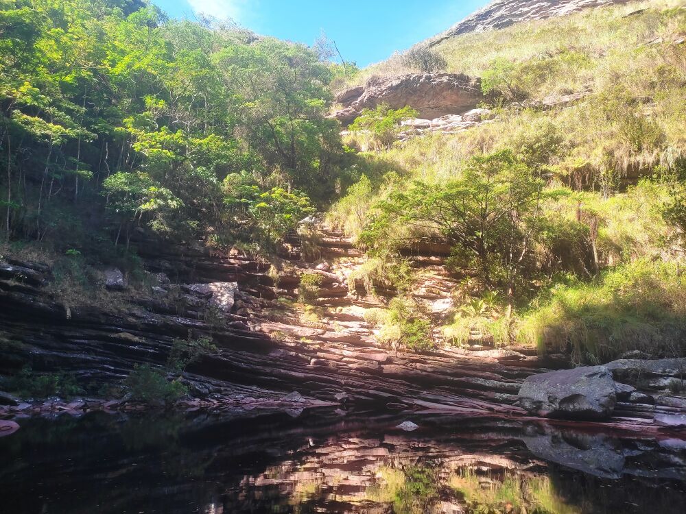 Nous atteignons Poção, notre le spot repas et camping, après avoir longé une rivière rendue rouge par le fer. Nous découvrons un enchaînement de petites piscines naturelles en cascade. Nous commençons par une baignade bien méritée pour nous rafraîchir avant de prendre notre déjeuner au bord de l’eau. Nous apprenons avec José que la Chapada en plus des nombreux oiseaux, insectes (dont de magnifiques libellules bleues et d’énormes abeilles) et plantes, abrite aussi des cobras, des tigres et des macaques. Et qu’il y a longtemps la mer était ici et que c’est elle qui a dessiné le magnifique paysage que nous admirons. Puis nous installons notre tente et laissons toutes nos affaires dedans sauf nos maillots, de l’eau et mon appareil.