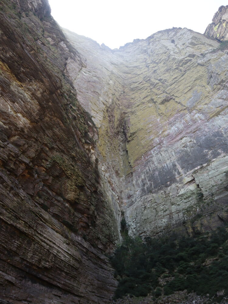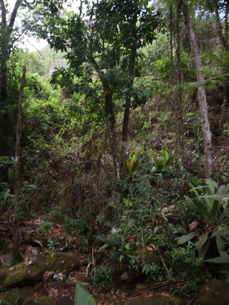 Après un bref passage sur les rochers du lit du cours d’eau presque à sec, nous nous engageons dans une végétation luxuriante dans laquelle il faut se frayer un passage en plus de faire attention où l’on met les pieds. Il fait une chaleur et une humidité terribles d’autant plus que le soleil finit par sortir. Nous avançons assez péniblement, avec des pauses régulières pour nous hydrater. En revanche, à peine une heure après le début de la montée, José s’arrête… On est déjà arrivés !? Notre nous raconte qu’il n’a pas toujours des gens si habitués à marcher, ou en tout cas à marcher ailleurs que dans les sentiers de forêt communale… Il a déjà mis 11h à faire le trajet d’aujourd’hui, en devant porter les sacs des personnes à bout de force !
