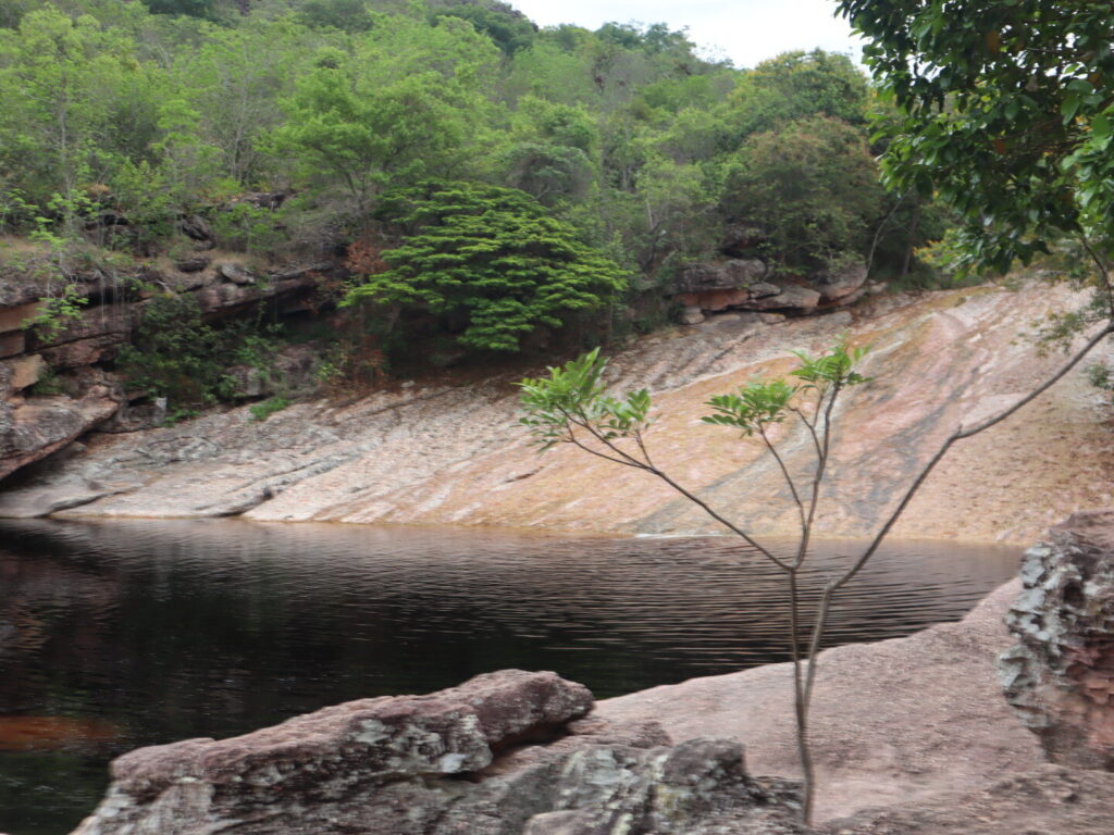 Au campement de la cachoeira, on peut rejoindre la cascade (à sec lorsque nous y étions) en une quinzaine de minutes. Avec la chaleur pesante il fait très bon se baigner dans le lac !